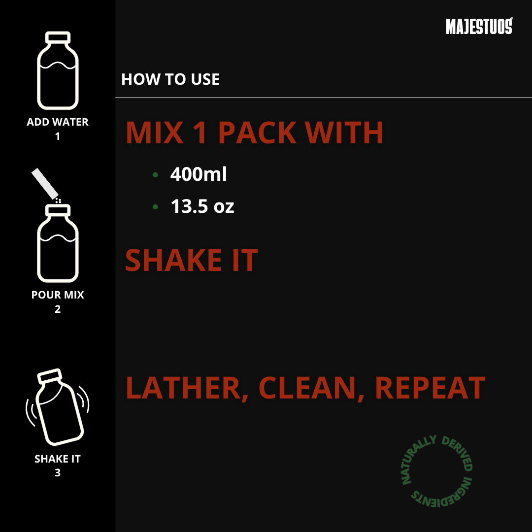 Pour it into a container with around 400ml/13.5oz of warm water. Shake it. Then just enjoy it, lather up for a gentle cleanse. And repeat.