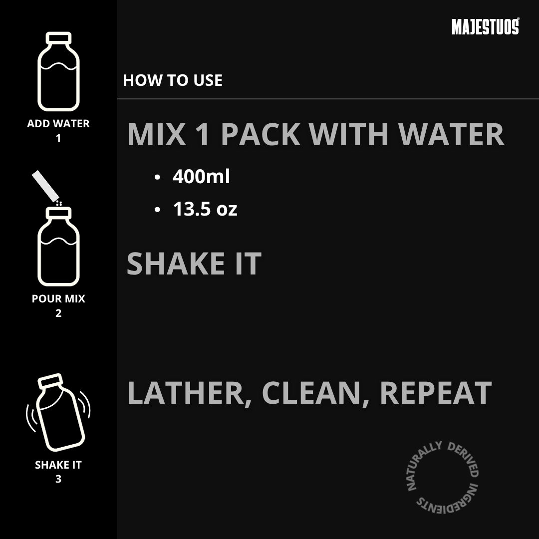 Pour it into a container with around 400ml/13.5oz of warm water. Shake it. Then just enjoy it, lather up for a gentle cleanse. And repeat.